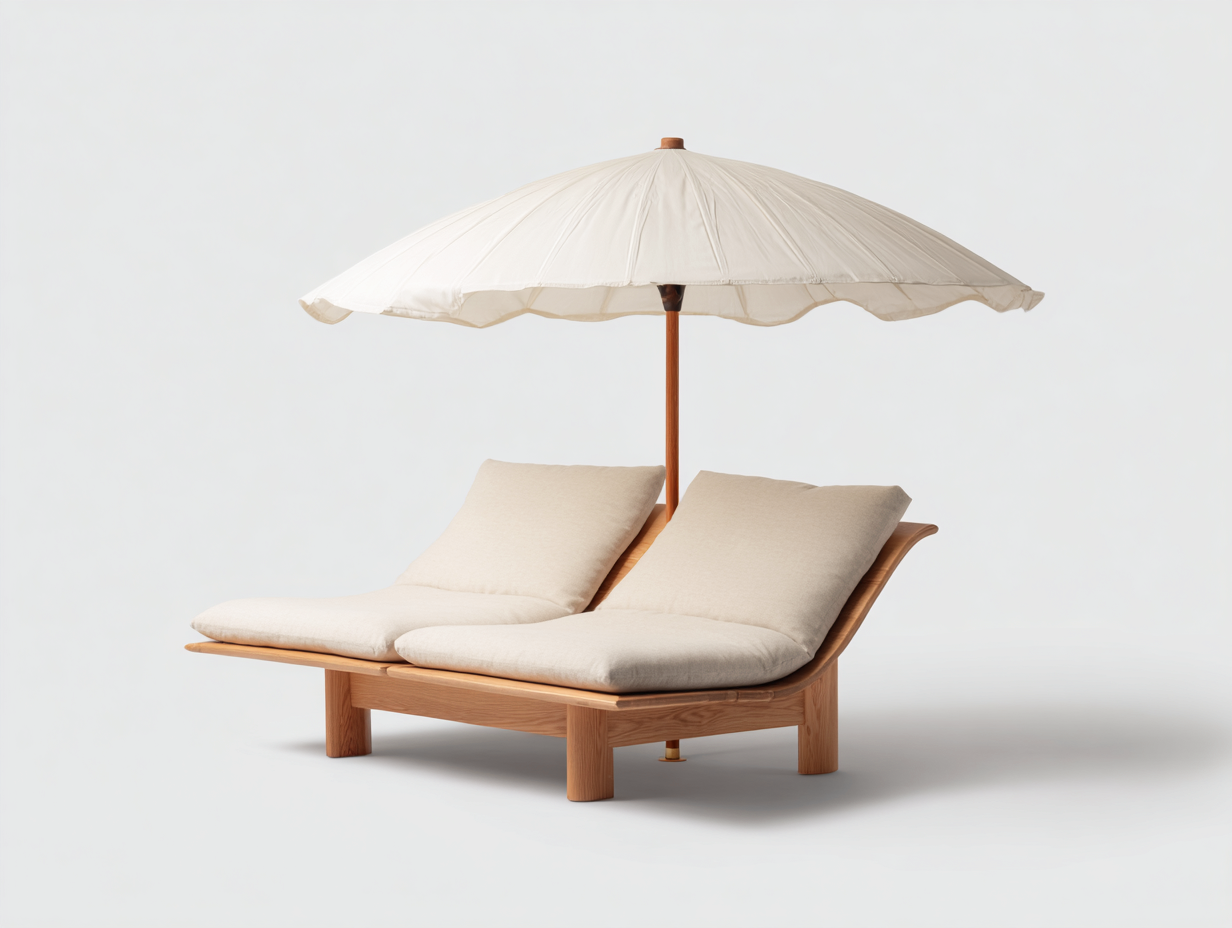 The double sun lounger features gently inclined backrests designed for comfortable reclining. The integrated parasol offers shade support for enhanced outdoor comfort while maintaining an open and airy feel.
